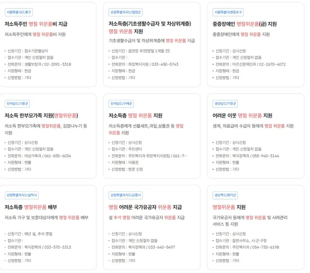 | 명절 위문품(현물) | 취약계층 전반 | 지자체·복지기관 | 식료품·상품권 | 현물 지급 | 자동 | 쌀·식료품·선물세트 등 |