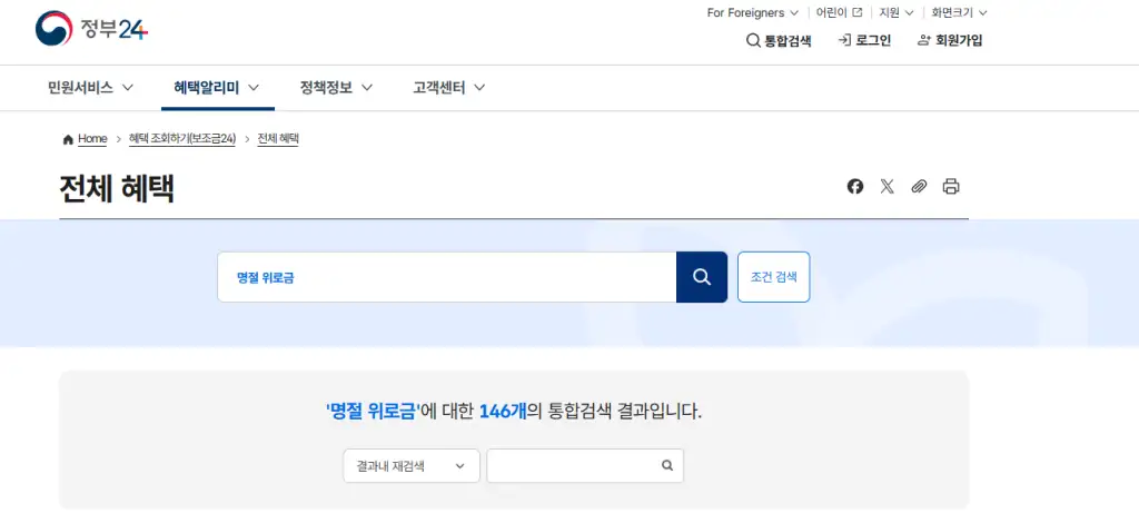 - 복지로(bokjiro.go.kr)에서 명절위로금, 명절지원금 관련 키워드로 검색
